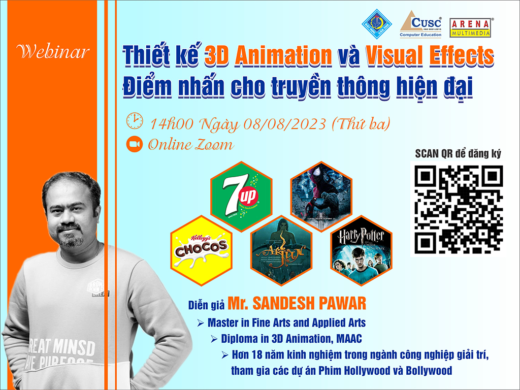 Hãy cùng tham gia Webinar: Thiết kế 3D Animation và Visual Effects - Điểm nhấn của truyền thông hiện đại - một sự kiện không thể bỏ qua dành cho những ai đam mê sáng tạo và muốn khám phá thế giới đầy sáng tạo của đồ họa 3D và hiệu ứng hình ảnh sống động cùng Mr SANDESH PAWAR chuyên gia hàng đầu trong lĩnh vực này. Thông tin sự kiện: