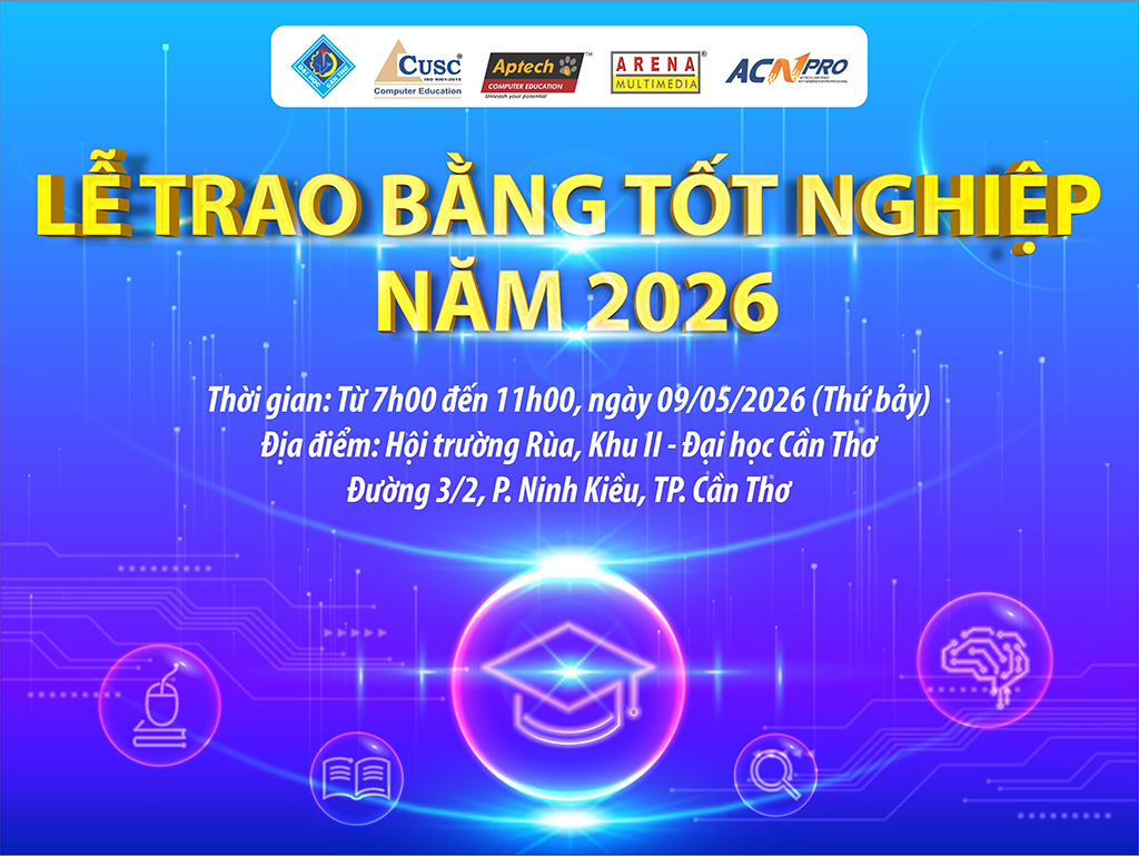 Trung tâm Công nghệ Phần mềm Đại học Cần Thơ (CUSC) tổ chức Lễ trao bằng tốt nghiệp cho các sinh viên ngành Lập trình viên Quốc tế - APTECH, Mỹ thuật Đa phương tiện Quốc tế - ARENA, Phân tích dữ liệu - ACN Pro vào ngày 09/05/2026. Đây chắc chắn sẽ là một khoảnh khắc đáng nhớ với tất cả chúng ta tại CUSC, là một cột mốc quan trọng trong cuộc đời của mỗi người, nó đánh dấu sự trưởng thành và sự tự lập trên con đường sự nghiệp tương lai.