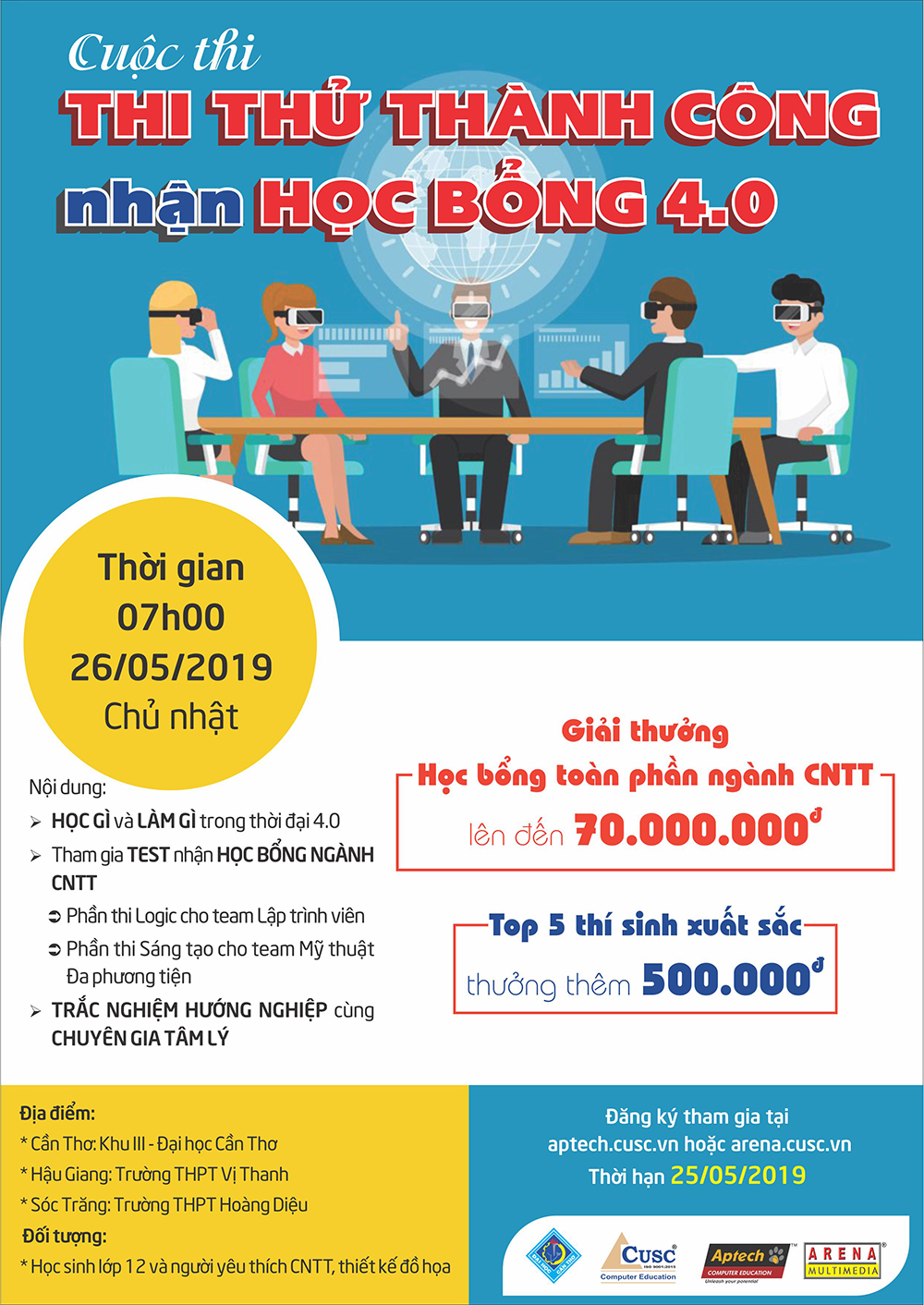 Cuộc thi THI THỬ THÀNH CÔNG nhận HỌC BỔNG 4.0 năm 2019 chính là sự kiện dành cho các bạn học sinh đang học lớp 12, yêu thích, đam mê ngành CNTT và thiết kế đồ họa tìm hiểu về chương trình đào tạo CNTT chuẩn Quốc tế của Tập đoàn Aptech - Ấn Độ để tự tìm ra câu trả lời cho vấn đề HỌC GÌ và LÀM GÌ trong thời đại 4.0.